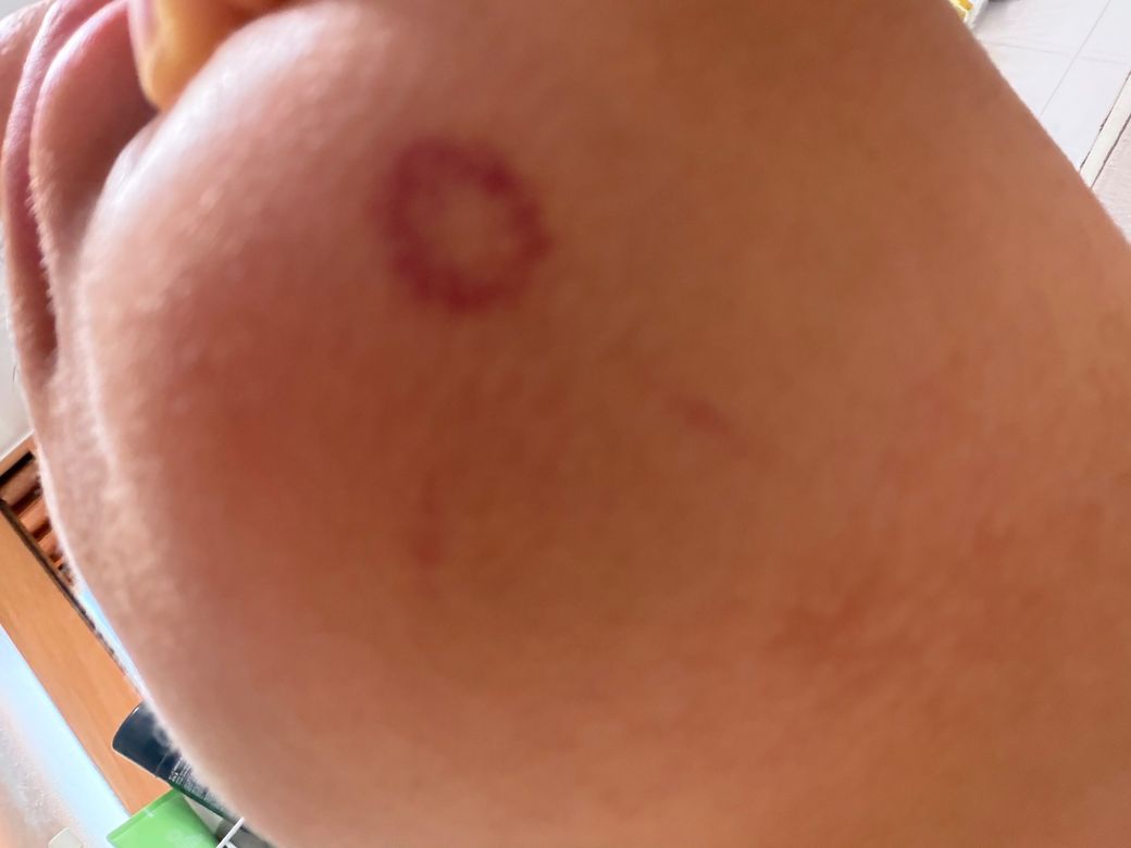 사진을 보면 턱 피부에 경계가 비교적 명확한 환형(고리 모양) 홍반이 관찰됩니다. 중앙부는 상대적으로 옅고 주변부 테두리가 더 붉게 올라온 형태로, 어제보다 오늘 더 진해졌다고 하셨군요.