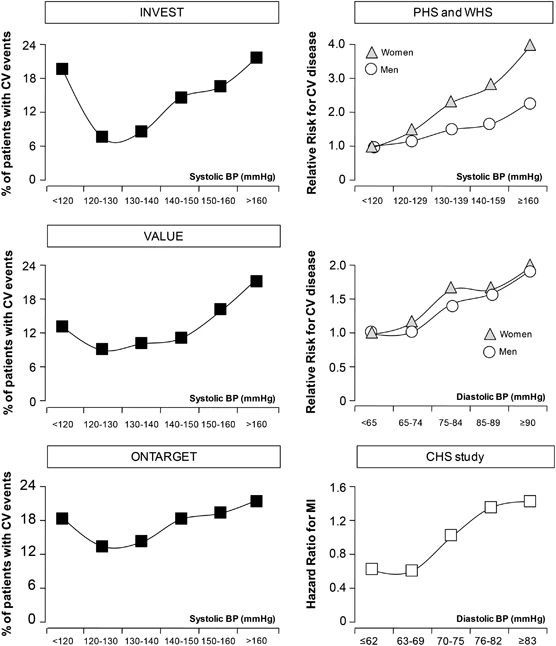 좌측 3개의 그래프에서도 수축기혈압 120mmHg 이상의 구간에서는 혈압이 높을 수록 심혈관질환의 발생이 늘어나나, 그 이하에서는 오히려 혈압이 낮을 때 심혈관질환의 발생이 늘어나는 것을 볼 수 있습니다.