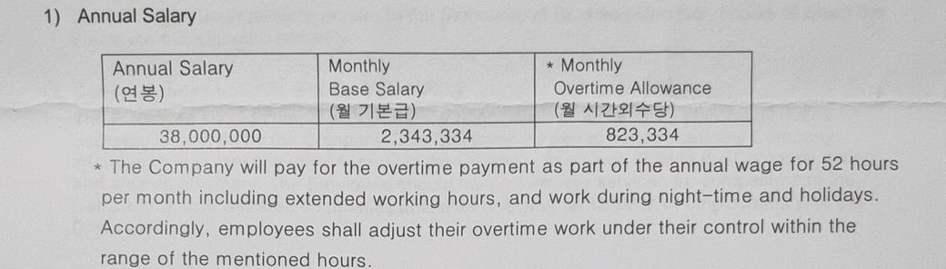 제가 근무중인 회사가 포괄임금제로 주 52시간을 일한다고 가정하고 임금을 주고있습니다(계약서상에서 per month라고 되어있는데 이상하긴 합니다)