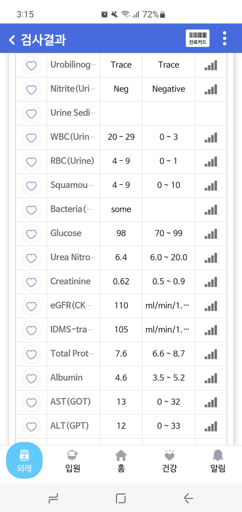한달전에는 빈혈수치8,단백뇨o,혈뇨x , 염증수치 높았는데 정확히 한달후의 결과는 조금 더르네요