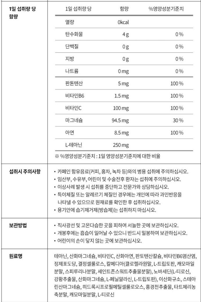 사진 첨부하신 영양제는 비타민B, 비타민C, 마그네슘, 아연, L-테아닌 성분으로 확인됩니다.