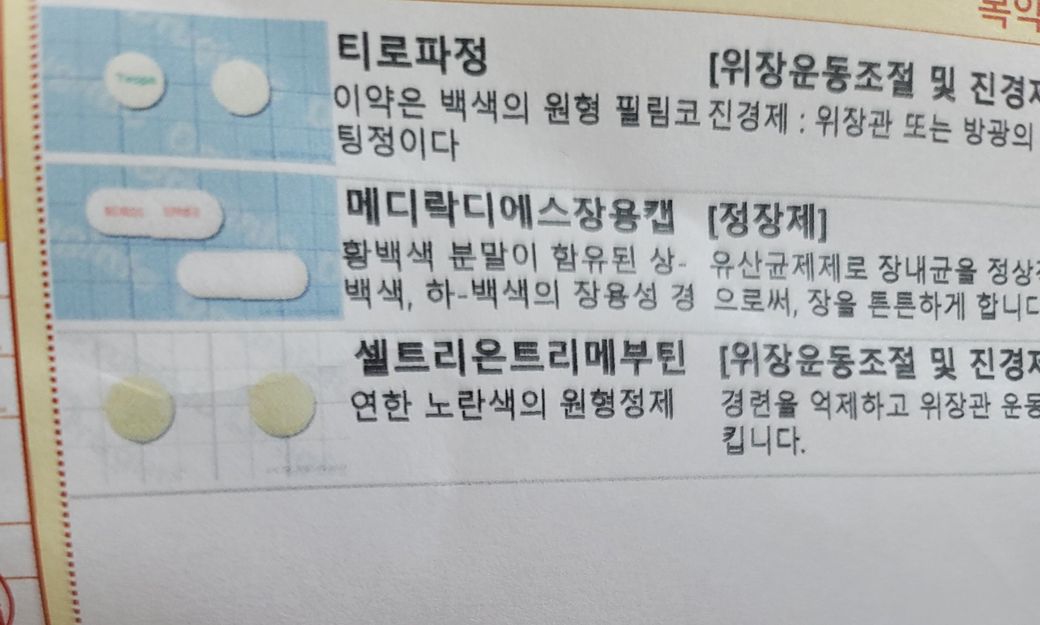 처방받븐 약은 복통과 설사증상을 완화하는데 도움을 주는 위장약으로 처방약을 복용하면서도 증상 지속시에는 병원에방문하여 추가적으로 지사제 및 세균성장염 항생제 처방이 필요로 될 수 있습니다.
