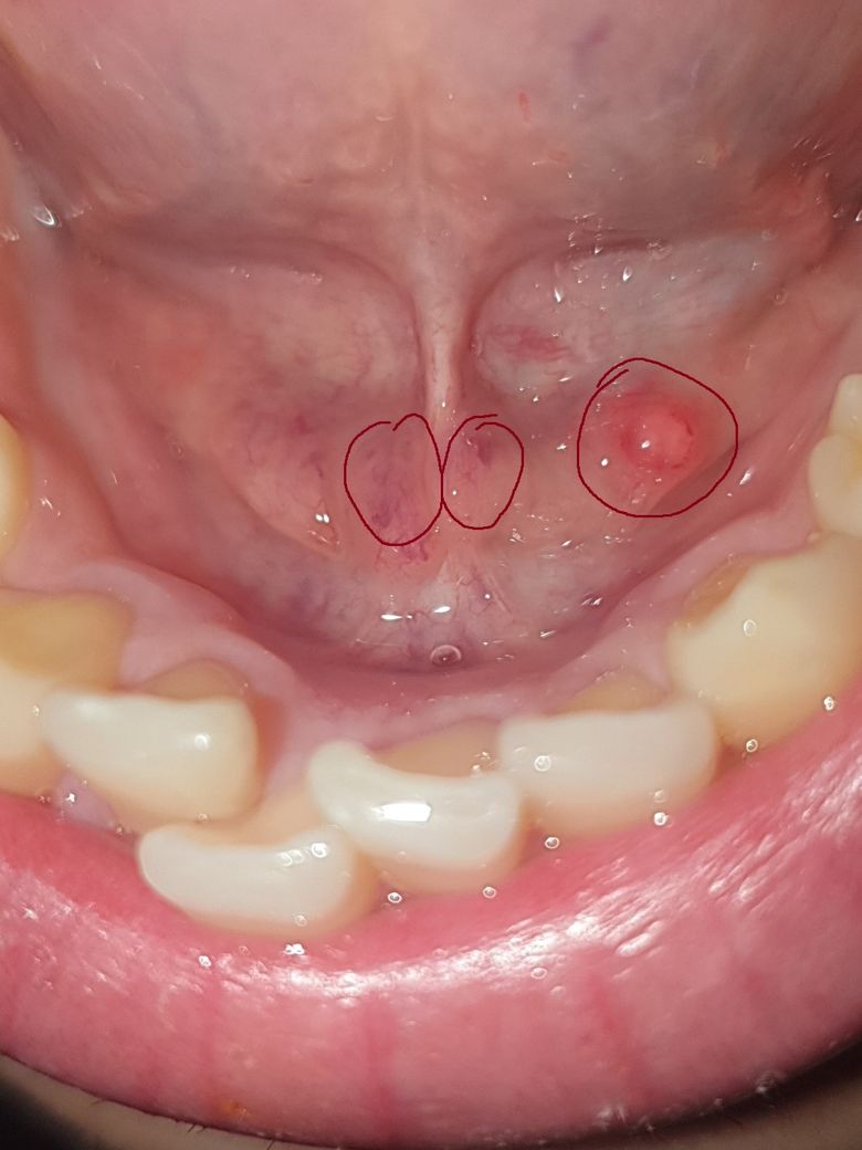 나란히 2개 붙은 동그라미 부분은 정상적으로 침이 나오는 구멍으로 보입니다. 뒷쪽 큰동그라미 부위는 물집이 잡힌 것으로 보이며 주로 상처 때문에 생기는 점액성 수포로 보입니다. 사이즈가 작아 저절로 없어질 가능성이 높아 보입니다. 3-4일 정도 기다려 보시고 저절로 안 없어지면 치과에 가서 흐트리면 됩니다.