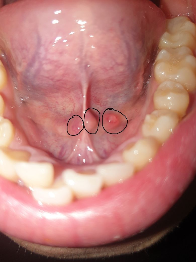 혀 밑에(동그라미 친 부분) 물집 같은 게 생겼더군요 ...