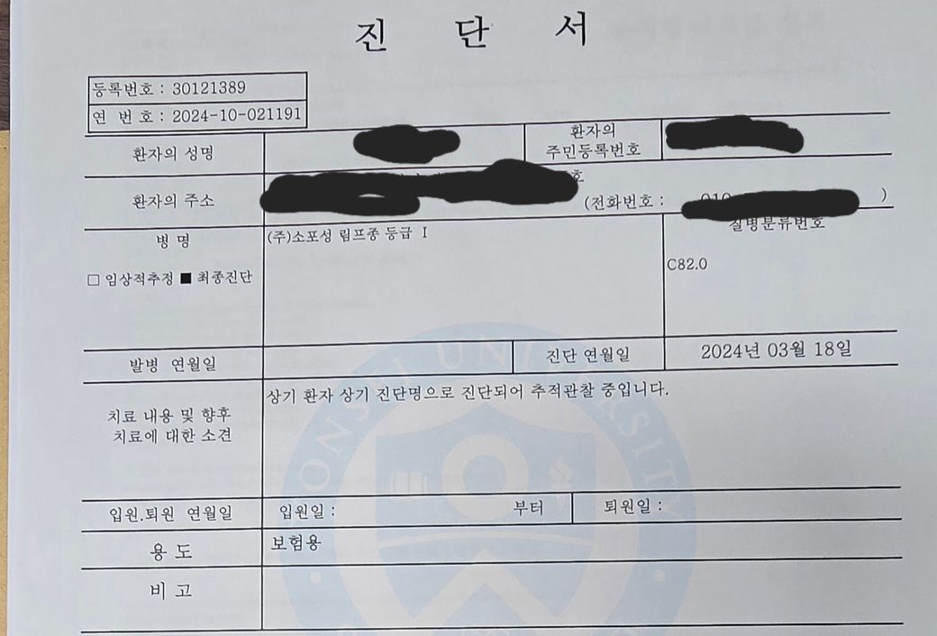 24년 4월 15일 소포성 림프종(C82.0)/진단서 최종진단
