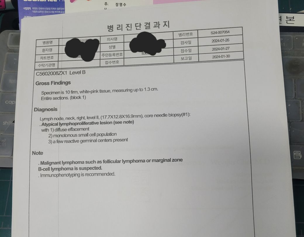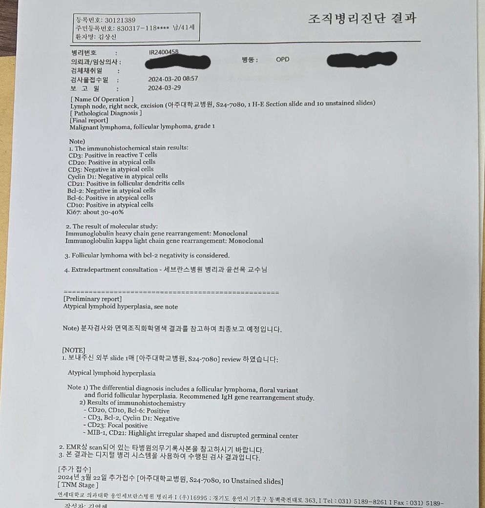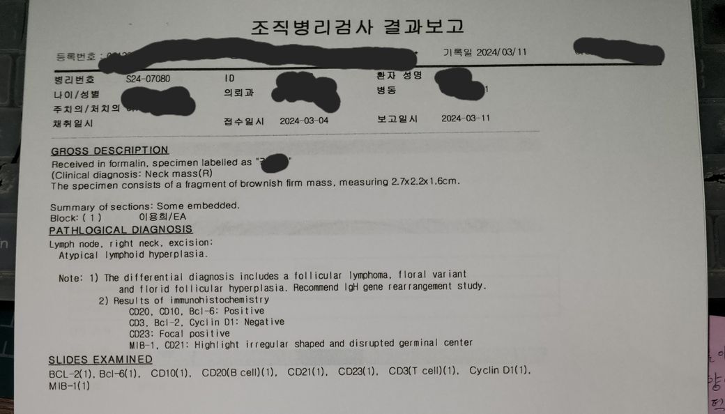 24년 2월 8일 검사 결과지 가지고 대학병원 진료 조직검사 결과 여포성 림프종 의심? 판정으로 협력병원에서 가저온 비염색 슬라이드 가지고 다시한번 대학병원에서 조직검사 실행.