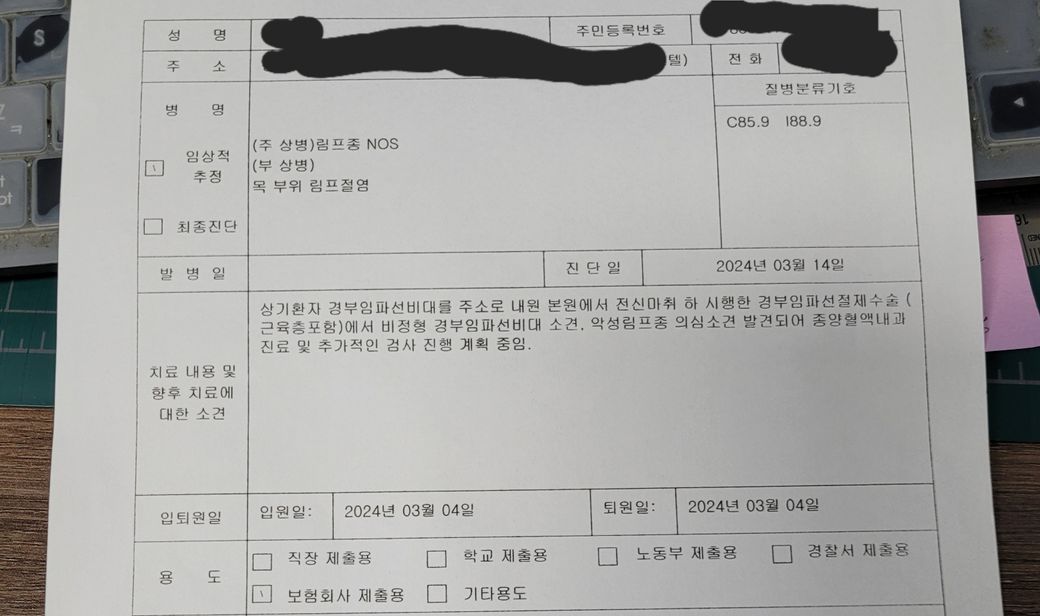 24년 3월 12일 결과 들었는데 악성 림프종 의심(진단서에는 주병력C85.9,부병력I88.9 임상적추정)으로 혈액종양내과 변경하여고 했으나 초진을 환자를 못 받아서 진료 의뢰서 발행