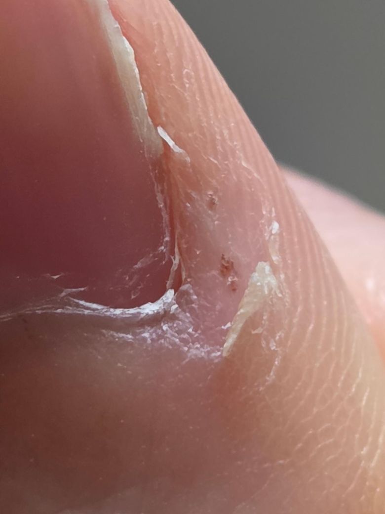사진상 병변은 전형적인 손톱 주위 사마귀(조갑주위 사마귀) 형태로 보이지는 않습니다. 사마귀라면 표면이 거칠고 두꺼워지면서 여러 개의 검은 점(혈관 혈전)이 뚜렷하게 보이고, 점차 커지거나 주변으로 번지는 경향이 있습니다. 현재는 손톱 옆 피부가 찢기고 각질이 들리면서 작은 점상 출혈 흔적이 있는 정도로, 반복적인 거스러미 뜯기와 미세 외상에 의한 피부 손상 및 경미한 염증(초기 손톱주위염)에 더 합당합니다.