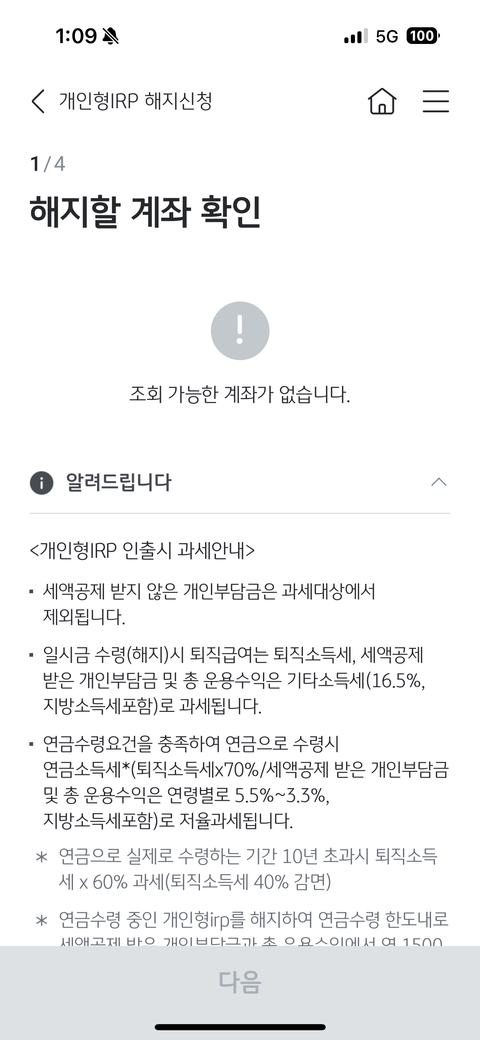 앱으로 해지 절차 따라가도, 계좌 조회가 안 된다고 뜹니다 ㅠㅠ 나의 퇴직연금에서는 보이고 금액도 다 들어왔는데...