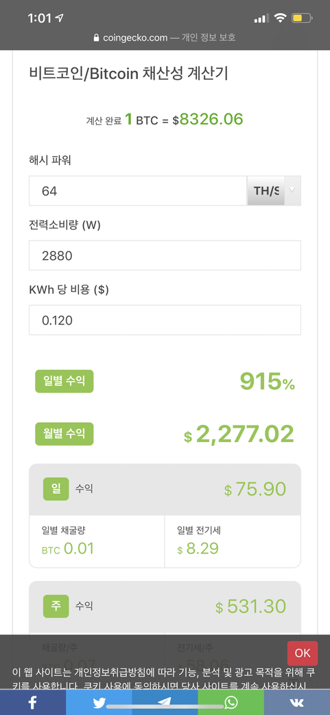 이정도면 사진과 같이 하루에 만원의 전기세와 0.01 BTC가 만들어지던데요.