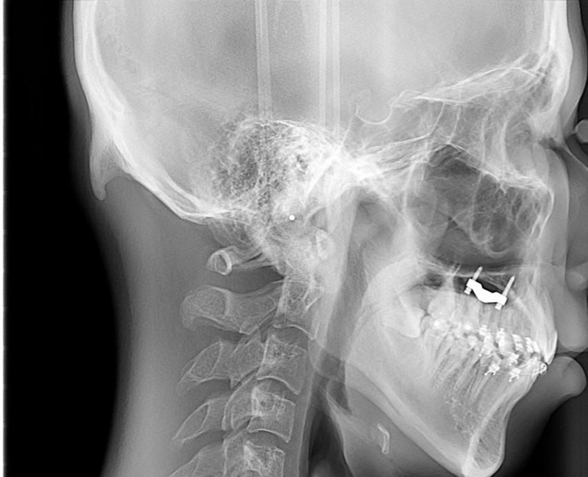 외후두융기(External occipital protuberance)는 후두골 뒤쪽 정중앙에 위치한 정상적인 해부학적 돌출입니다. 개인마다 크기 차이가 있으며, 일부에서는 비교적 크게 돌출되어 보일 수 있습니다. 첨부된 측면 두개골 X선에서도 후두부 뒤쪽에 비교적 뚜렷한 골성 돌출이 보이지만, 단순히 크기가 크다는 이유만으로 병적 상태로 판단되지는 않습니다.