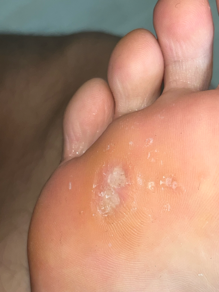 적어주신 내용으로 미루어 티눈의 가능성이 생각되나 올려주신 사진만으로는 제한적으로 피부과 진찰을 권합니다.