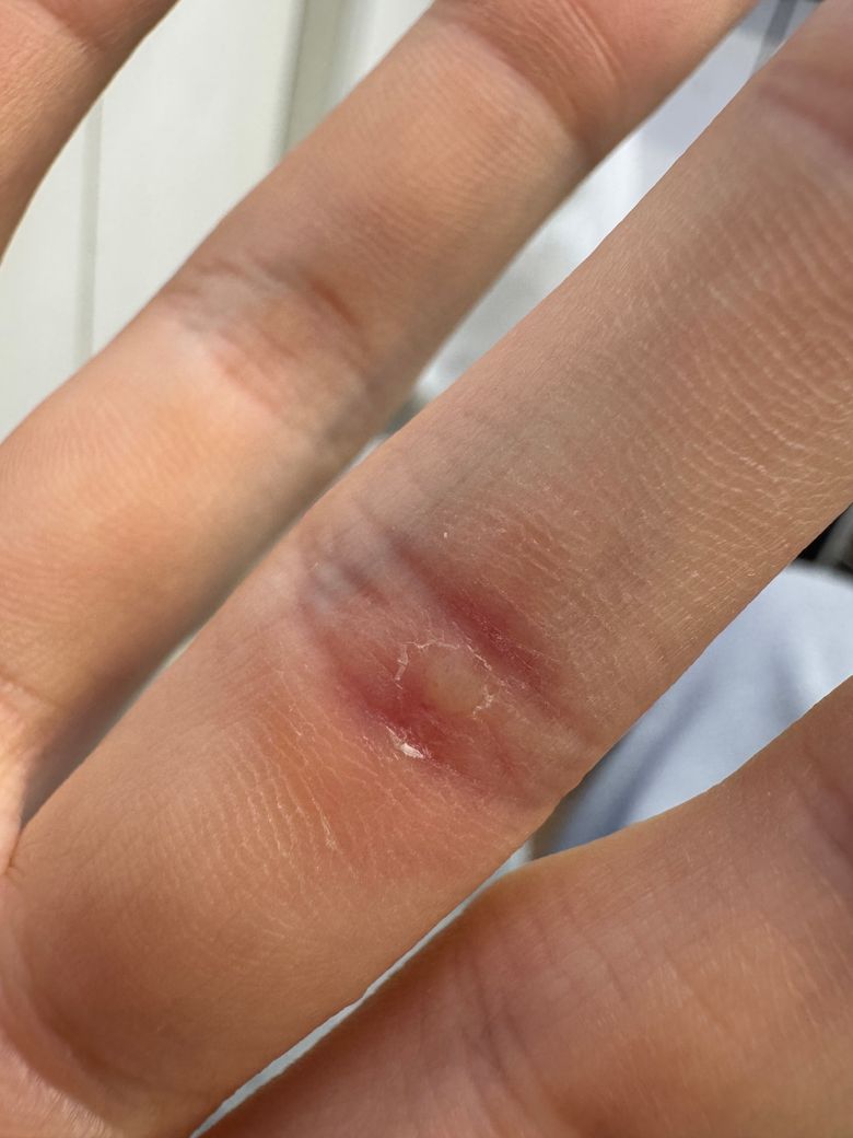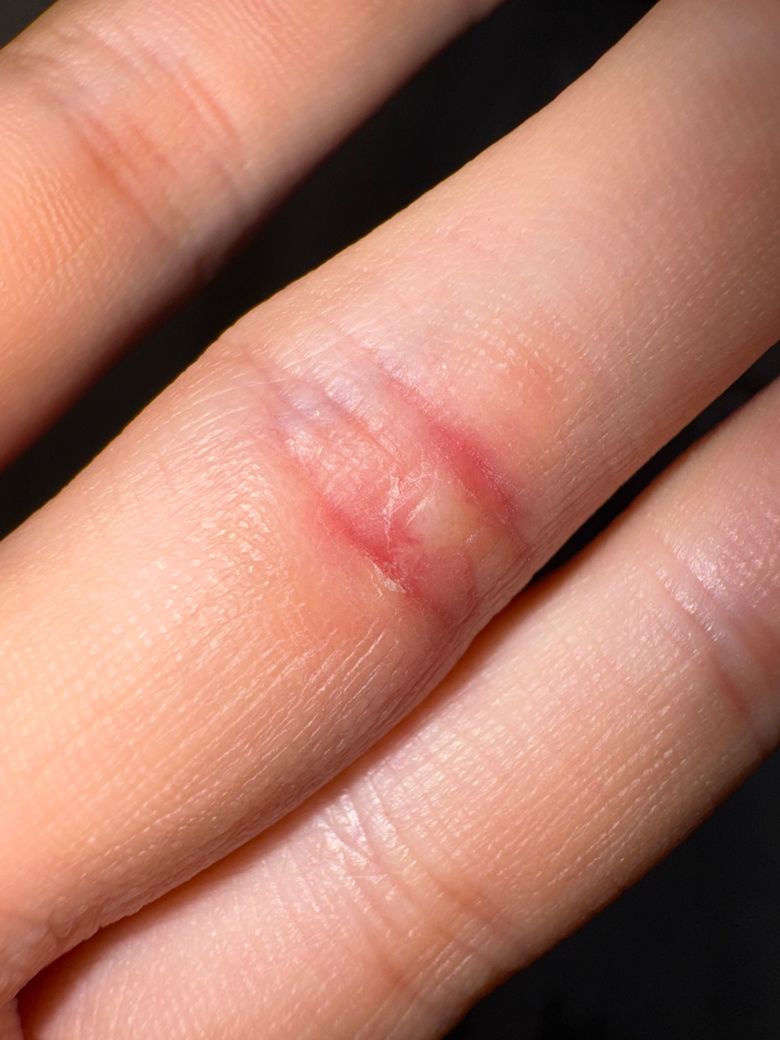 사진으로 상처 부위를 제대로 파악 할 순 없지만 한 달 전 강아지에게 물린 손가락 관절 부위가 아물었음에도 불구하고 피부 아래에 물집 같은 것이 생기고 누르면 아픈 증상이 있다면, 몇 가지 가능성이 있습니다.