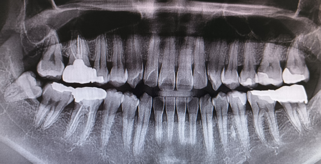 1. 특별히 가장 문제가 되는 부분이 본인 기준으로 오른쪽 아래 사랑니 앞에 치아입니다. 사랑니에 의해서 치아에 충치도 생겼으나 잇몸도 상당히 많이 내려간 상태입니다.