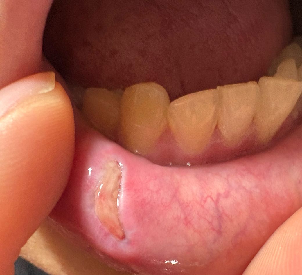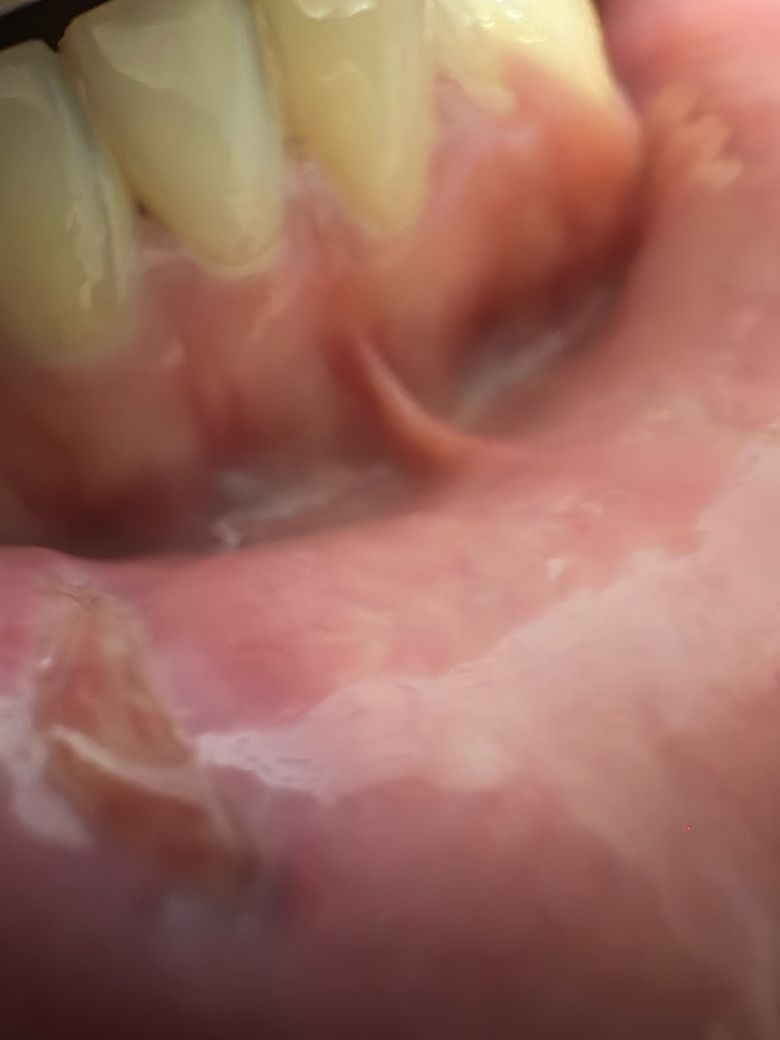 수술 후 아물어가고 있는 소견으로 보입니다. 아직 회복을 위해서는 시간이 필요할 것으로 보입니다만 점막 부위라 생각보다 빠를 수도 있습니다. 피가 비치는 것은 크게 상관 없으며 출혈이 발생한 것이 아니라면 우선은 위생 관리를 해주며 경과를 지켜보아도 무방할 것으로 사료됩니다. 그럼에도 너무 걱정되고 우려스럽다면 수술 받으신 병원에서 상태 재평가를 받아보시길 권고드립니다. 막 응급실에 가야되고 응급 처치를 받아야 하고 그런 상황이라고 볼 정도는 아닐 것으로 보입니다.