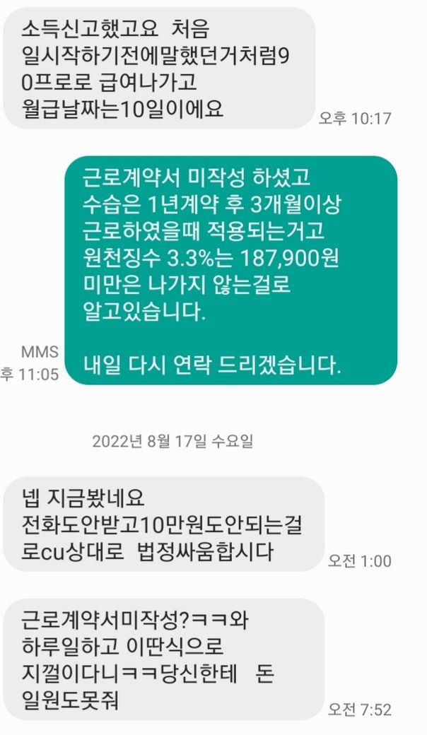 다름이 아니라 근무지 지각으로 인하여 해고통보 후 정확한 급여 계산을 하기 위해 사장님과 이야기하였고 계약서 미작성건과 해고 후 14일 이내 급여 미지급시 임금체불로 노동청에 진정서를 내겠다고 말씀 드렸습니다.