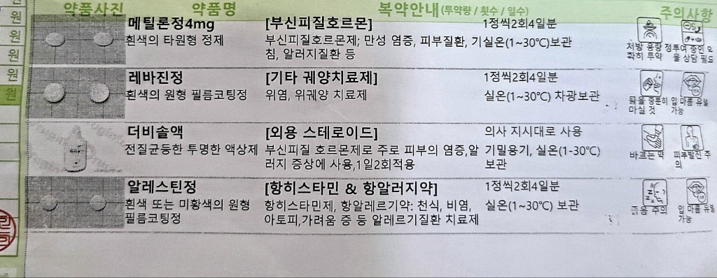 문의주신 약중에 메틸론정이 스테로이드제로 위장 자극감으로 인해 울렁거릴 가능성이 있으며 우선 식후에 복용을 해보고 이러한 증상 지속시에는 병원에 재방문하여 위장약을 추가로 처방받길 권장드립니다.