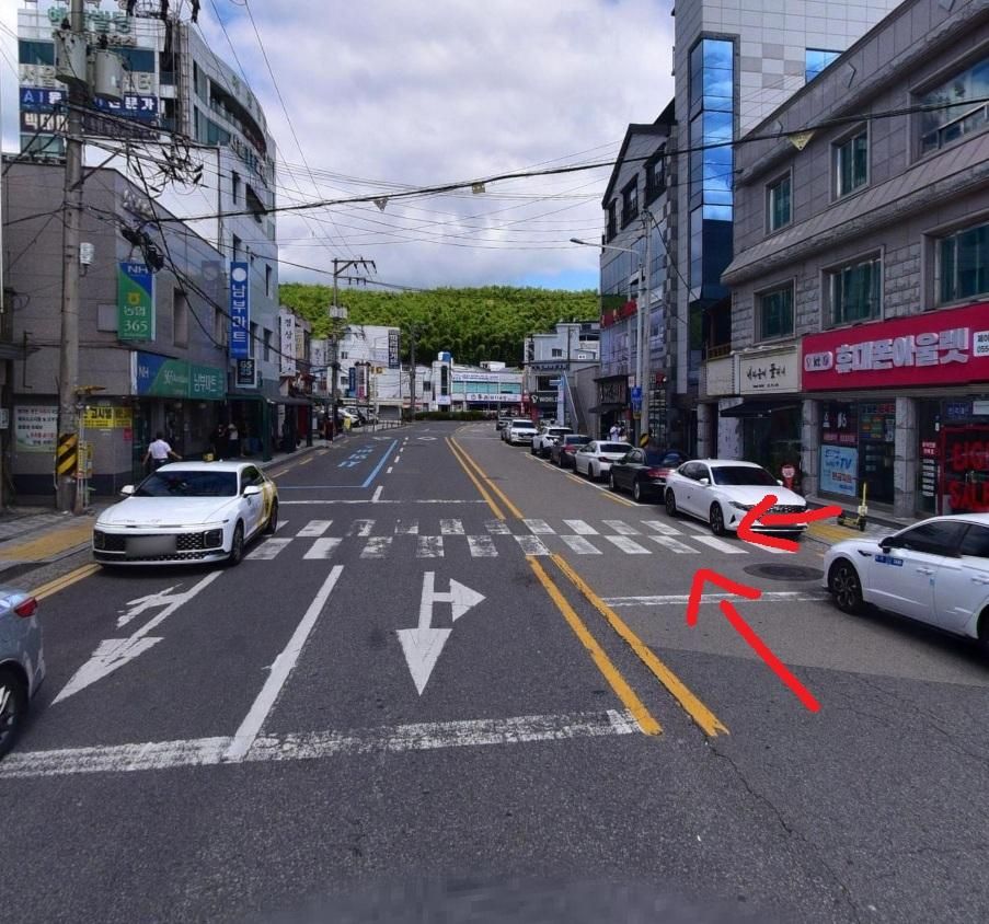 자전거는 탑승한 상태로 횡단보도를 건넜고, 횡단보도 앞뒤로 불법주차 차량때문에 나오는걸