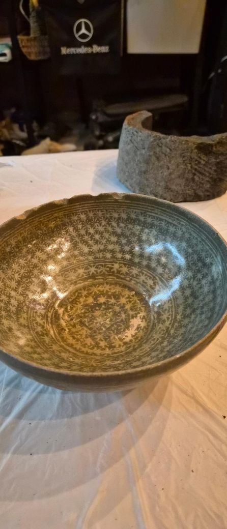 이것은 조선시대 15세기에 제작된 분청사기 인화문 대접으로 보입니다.