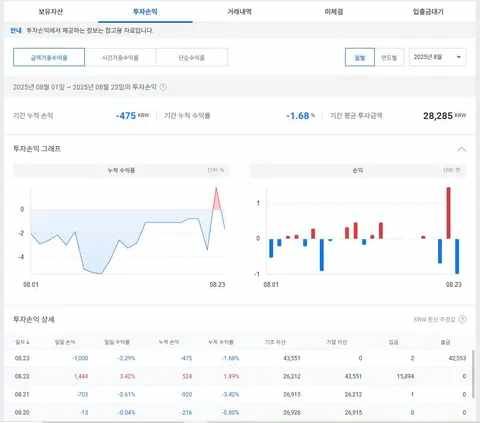 아.. 분명히 8월 23일에 거래한 적이 없는데 손실봤다고 나옵니다.. 제가 분명히 22일에 크게 수익을 봐서 당일 매도를 했는데
