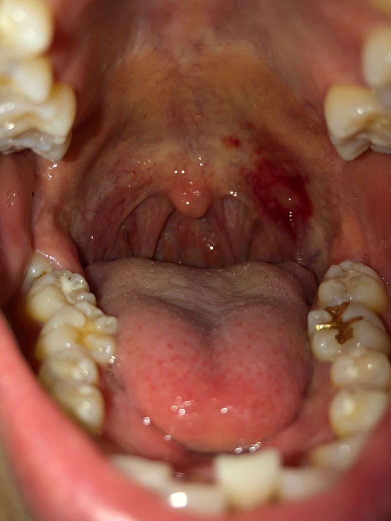 석션이 목구멍쪽으로 가셔서 그런것같습니다. 자주 있는일은 아니지만, 가끔 발생할수 있습니다. 치과에 가셔서 말씀하셔도 되지만, 시간이 지나면 괜찮아 지는부분이라 크게 걱정은 안하셔도 될것같습니다.