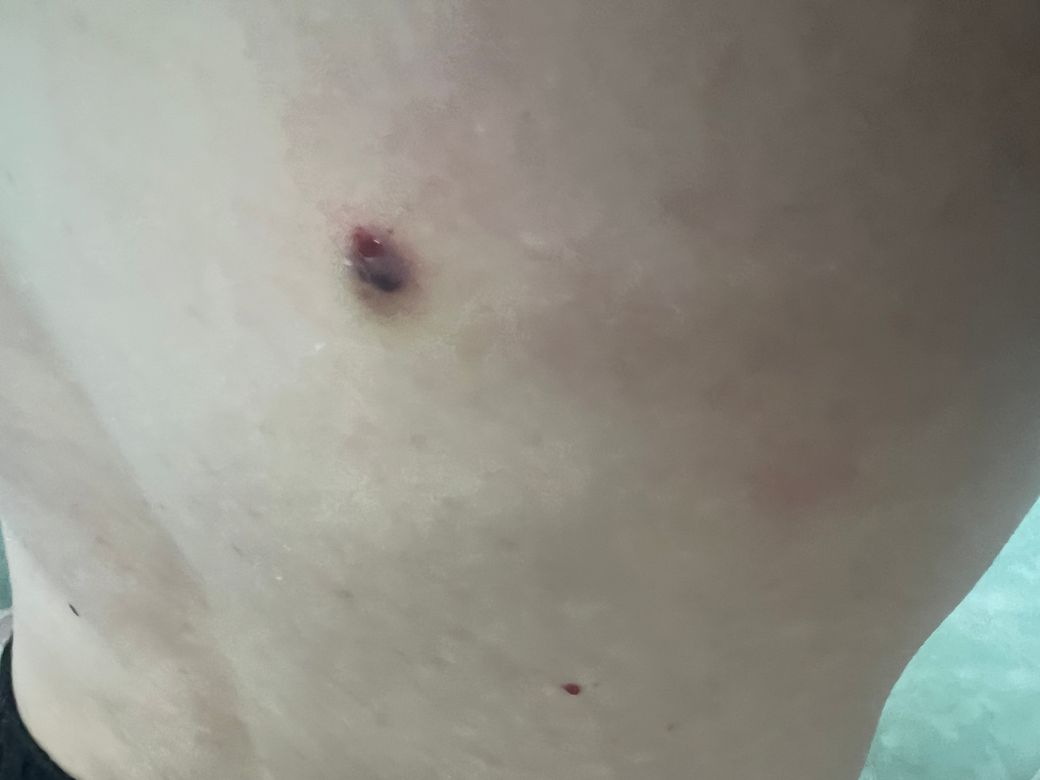 흰옷을 입고 벗었는데 옷에 피처럼 뭍어있어서 만져봤는데 울퉁불퉁합니다 만지면 여드름짠것 처럼 따갑고 짰더니 피가 났습니다..