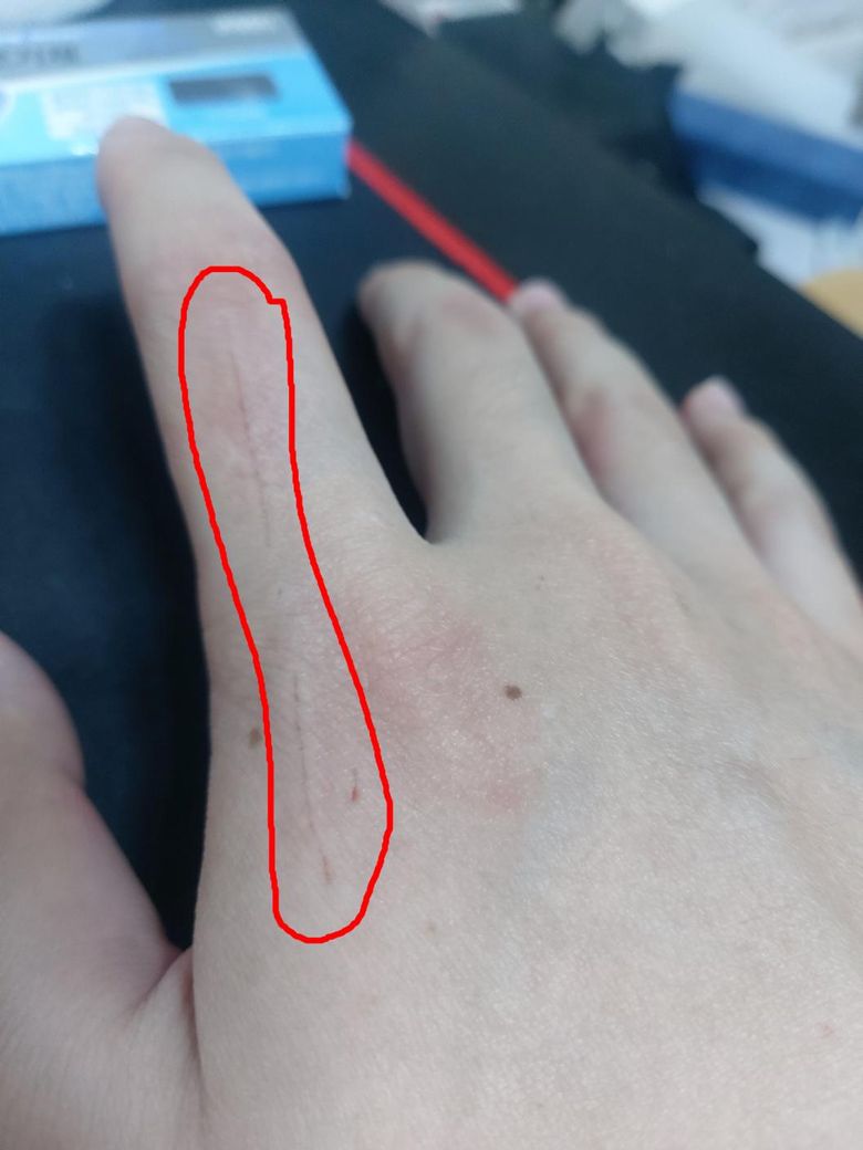 긁힌 부분만 볼록하게 사진에서 보듯 확연히 살짝 부어 올라 있습니다