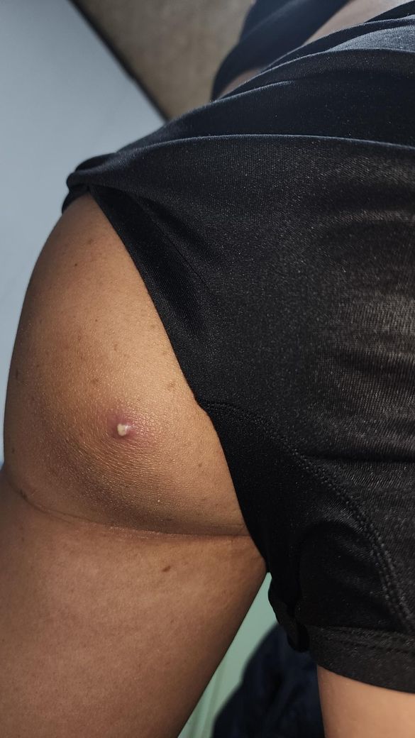 설명으로 보면 가장 가능성이 높은 것은 엉덩이 종기(피부 농양, 모낭염이 진행된 상태)입니다.