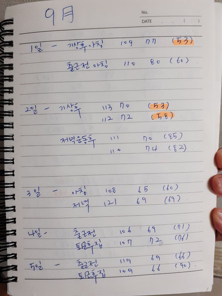 106/68(41) ,120/78(43)이 나옵니다. 맥박 40대가 나온건 이번이 처음입니다.