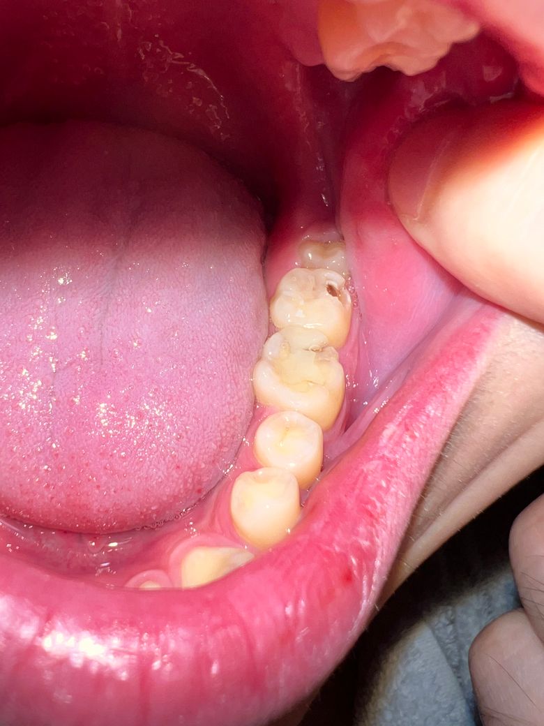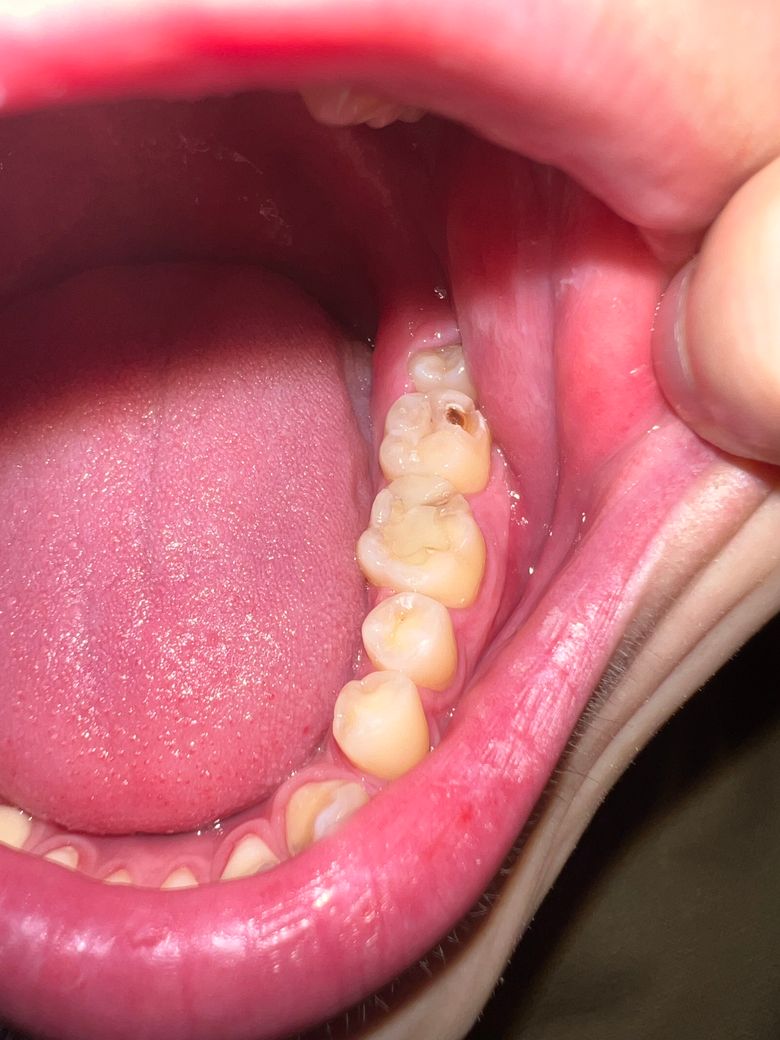 원래 홈이 있던 치아였으나 시간이 지나 구멍으로 발전됐었습니다. 어제 음식을 먹다 나서 갑자기 구멍이 아니라 이러한 상태가 됐는데요?.. 치아가 떨어져 나갈때 통증은 없었으며 현재도 통증은 없는 상태입니다