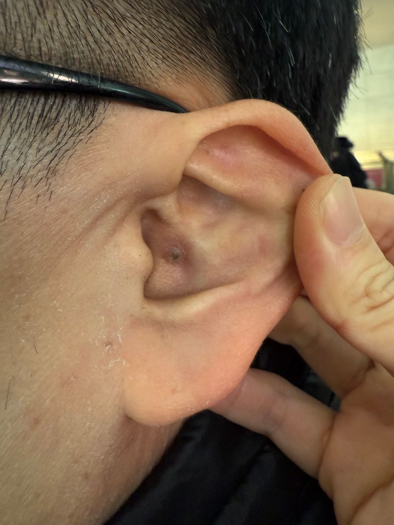 귀속에 이상태로 2년 이상 된 것 같은데 이게 뭘까요! 검정색 부분이 좀 진해지고 커진것 같기도 하고요. 가여움이나 통증은 없는 것 같아요