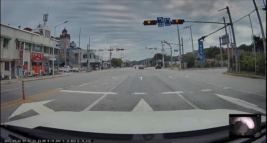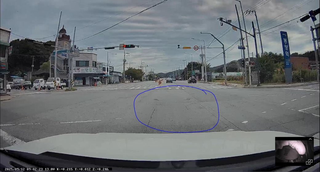 신호등이 황색등으로 바뀌어 신속하게 지나가려고 했는데 정지선을 넘는 순간 빨간불로 바뀌었습니다. 그래서 부득이하게 바닥 센서(파란색 원으로 강조한 부분)를 밟고 지나갔는데 단속구간을 지나는데 2초 정도를 소비하였습니다. 아무리 봐도 걸린 것 같은데 제가 신호위반을 한걸까요?