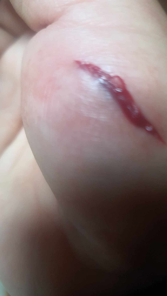상처를 완전히 닦으면서 관찰해보아야 하겠지만, 피하조직이 조금 튀어나온 것으로 보아 꽤나 깊게 상처가 난 것으로 보이고 이 경우 봉합이 필요합니다. 당장 병원을 방문할 수 없다면 거즈나 밴드로 덮어두시고 가급적 빨리 정형외과를 방문하시기 바랍니다.
