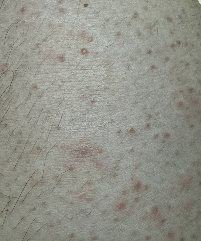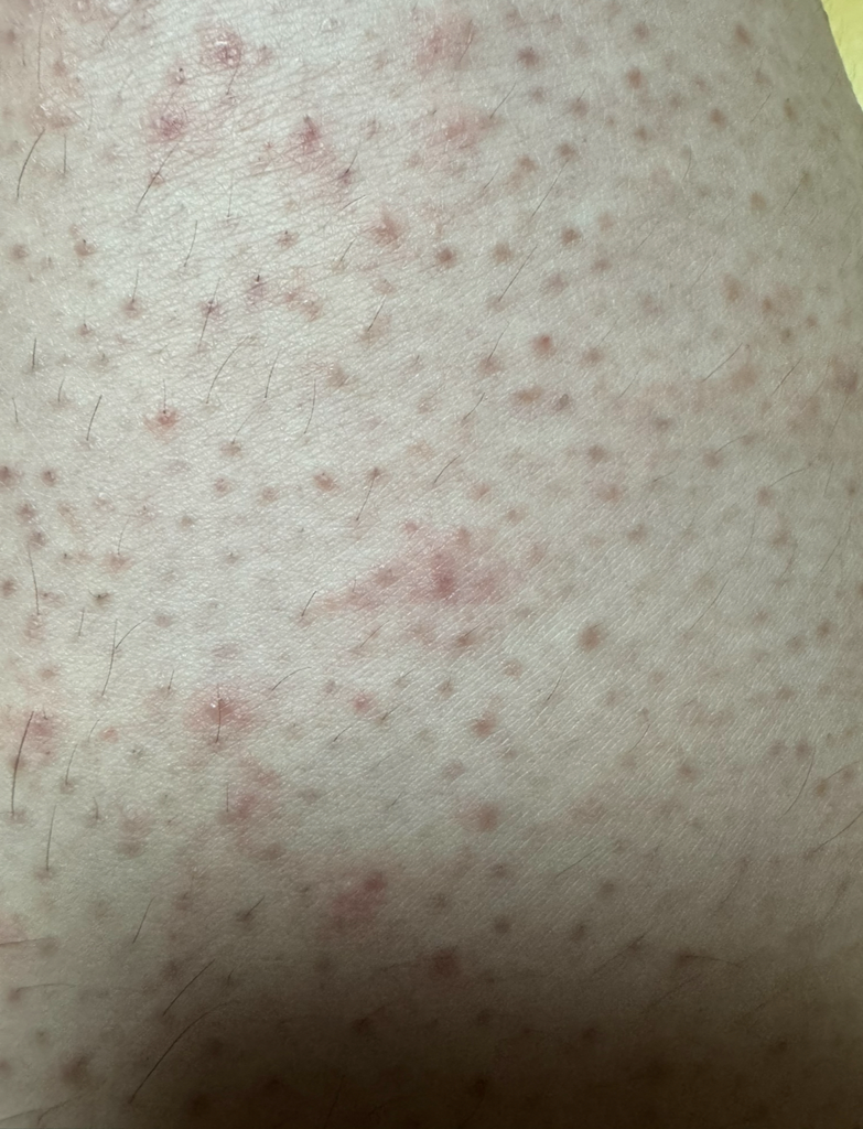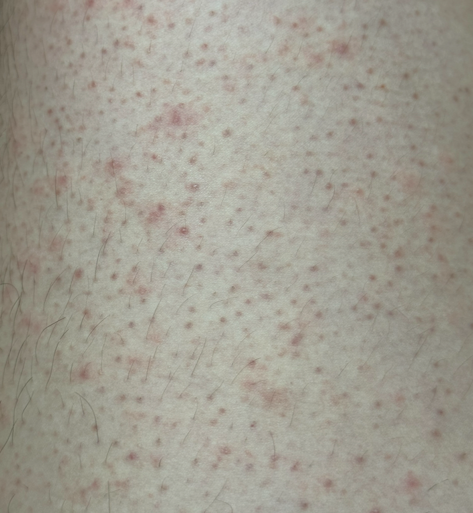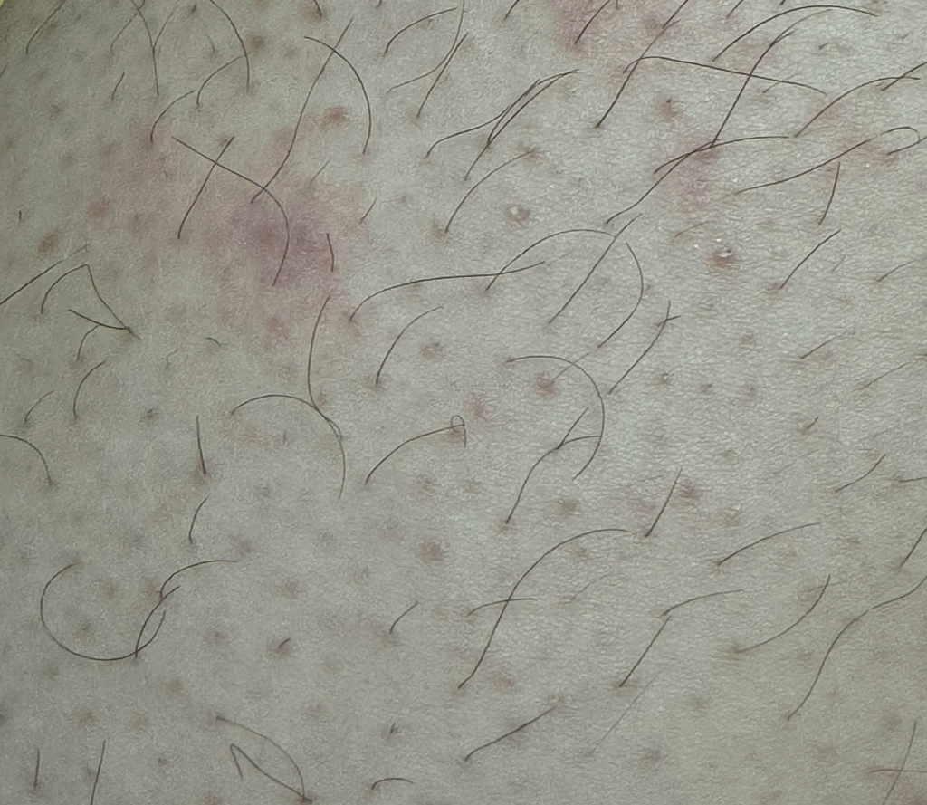 모공각화증이나 모낭염 같은 질환을 의심해볼 수 있는 소견입니다. 정확한 감별 진단 및 치료를 위해서 피부과적으로 진료를 받아보시길 권고드립니다.