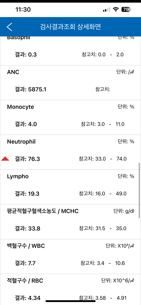 호중구는 염증이 있을때 상승할수 있는데 백혈구가 7000 개 중에서 호중구 비율이 약간 올라간건 의미없겠습니다.