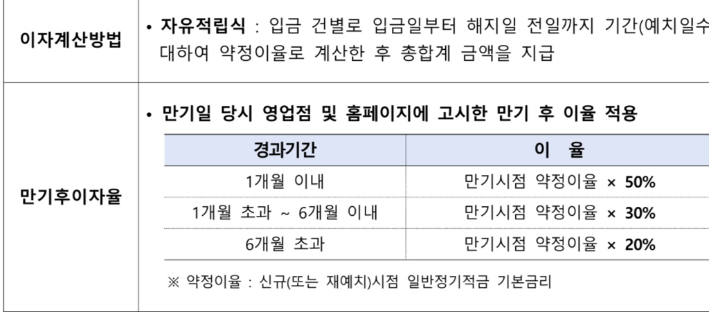 따라서, 만기 후 추가로 입금한 금액에 대해서만 이율이 바뀌는 것이 아니라, 만기 후까지 납입한 모든 금액에 대해 만기 후 이자율이 적용됩니다.