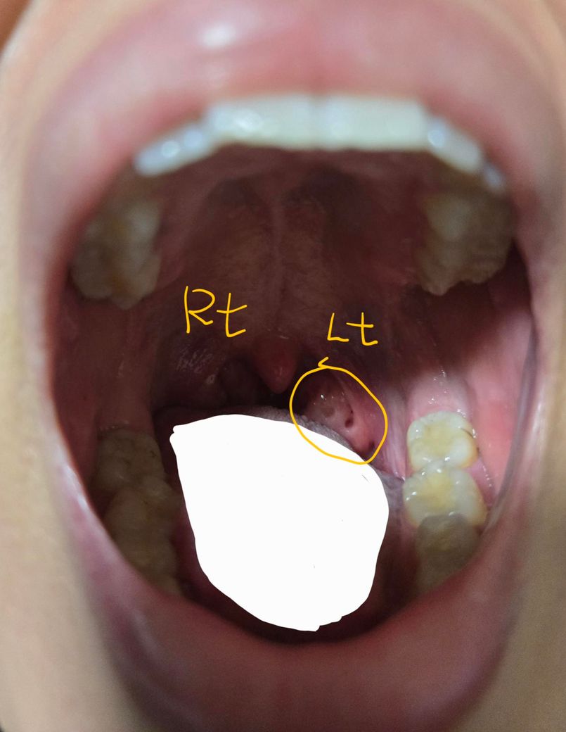현재 사진에서는 왼쪽 편도에 구멍이 있는 것으로 보입니다. 보통, 편도 소립이라고 불리우는 구멍인데 해부학적으로 구조가 달라서 한쪽에만 결석이 생기는 경우가 간혹 발생하기도 합니다. (따라서 원래 한쪽만 그렇다고 보기는 어렵습니다.)