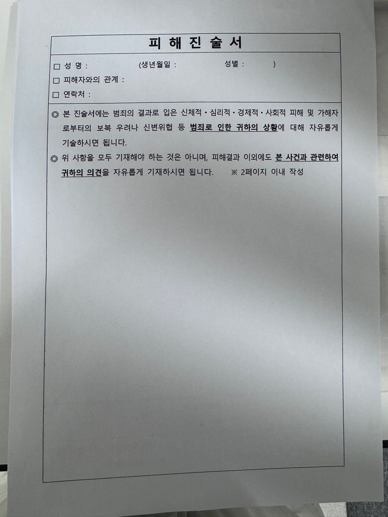 범죄피해평가제도를 알려주셔서 심리검사 및 1차 상담을 끝내고왔는데 다음번 상담까지 피해진술서를 작성해오라고하셨는데 어떤 방향으로 써야하는지 감이 안와서 질문드립니다. 현직 경찰 및 검사님들 도와주세요