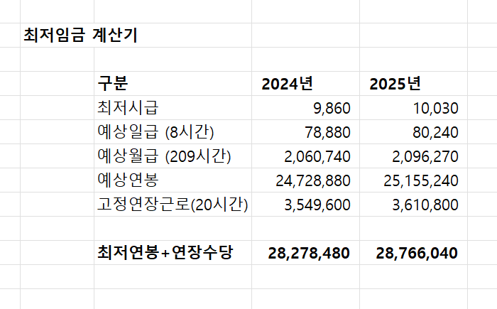 최저임금 기준, 209시간 월급이 2,096,270이니 연봉은 25,155,240원입다