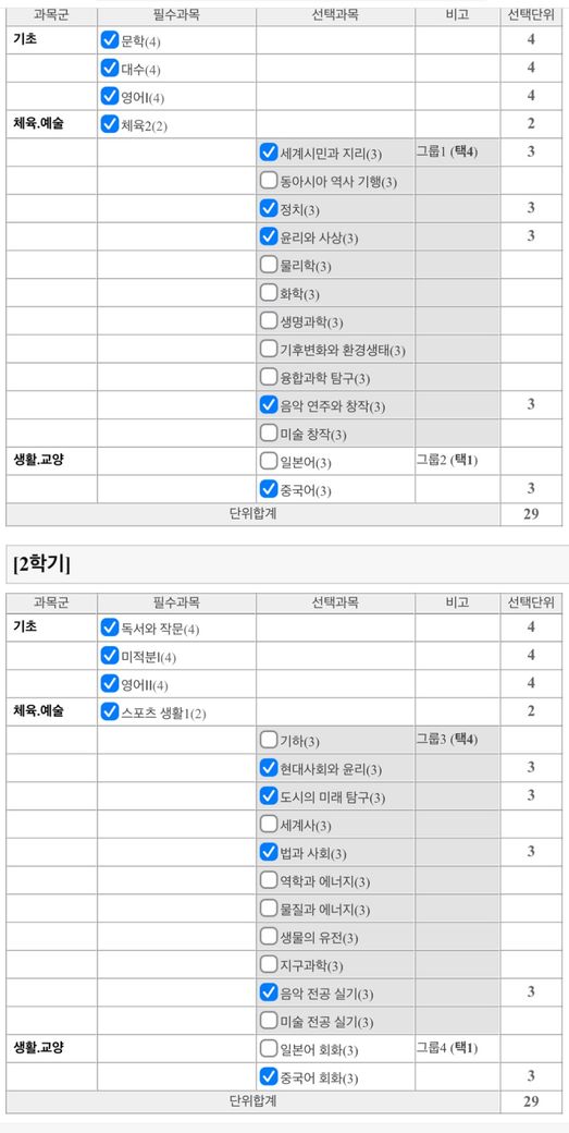 아래는 제가 선택한 2학년 1학기/2학기 선택과목인데요