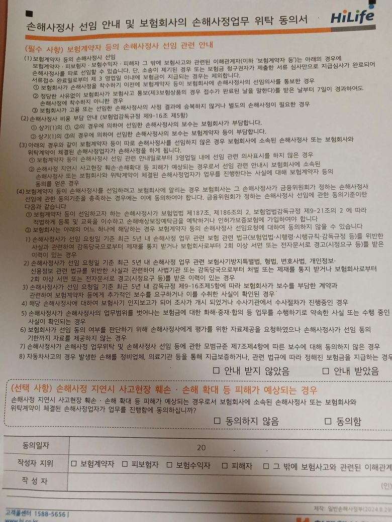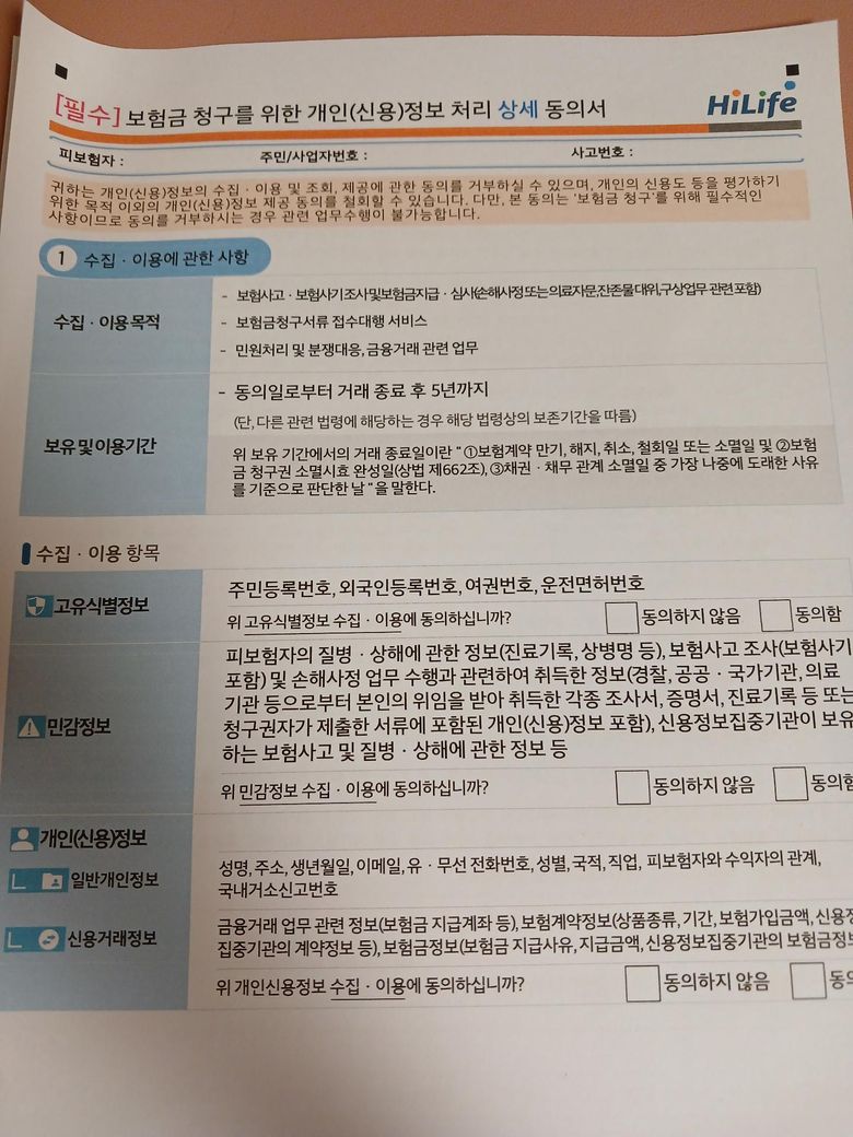 손해사정인이 연락이와서 사진으로 첨부된 서류를 작성해서 보내달라는데, 민감정보 내역도 다 동의해야하나요?