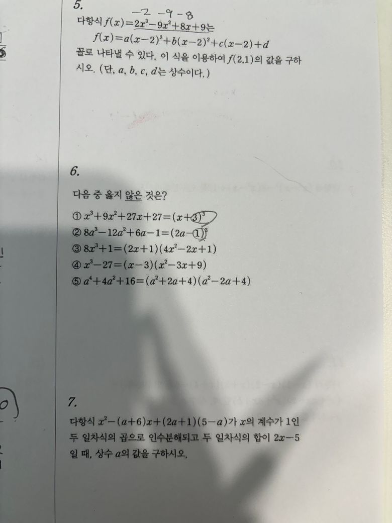고1 공통수학1인데 나머지 정리와 인수분해 부분이에요 어떻게 푸는지 모르겠어서 답이랑 풀이과정 좀 알려주세요!!ㅠ 감사합니당