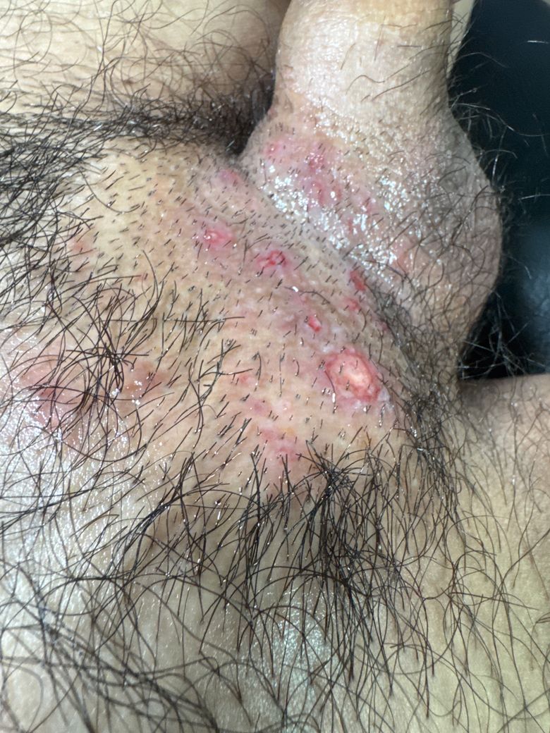 성기 위쪽 피부가 뭔가 갉아 먹은거마냥 살이 뜯겨나가고 그 주위에 여드름처럼 뭐가 났는데 이건 무슨병인가요?