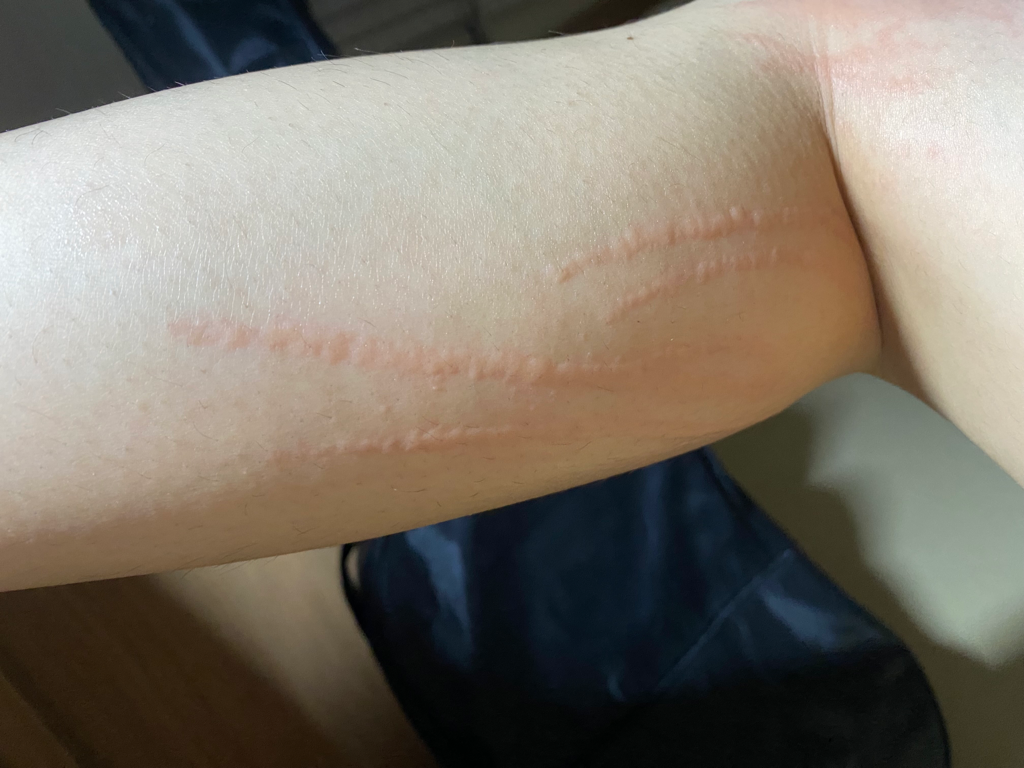 물리적 자극을 주었을 때 피부 발진과 가려움이 유발되면 피부 묘기증이라고 볼 수 있습니다. 피부 묘기증은 자극을 주지 않는 것이 가장 중요한 예방이자, 치료입니다. 가려움이 심할 때만 항히스타민제를 복용하거나 냉찜질을 하시면 괜찮아질 겁니다.