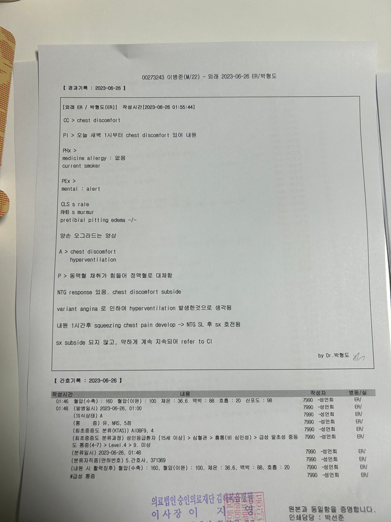 선생님께선 과호흡증후군과 스트레스성흉통이 같이 동반되는거 같다 라고 하셨습니다 변이형 협심증도 의심이 된다고 하셨습니다