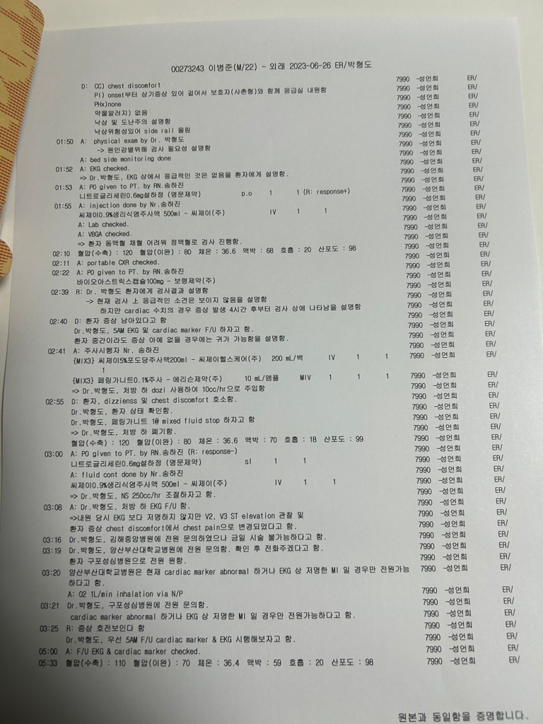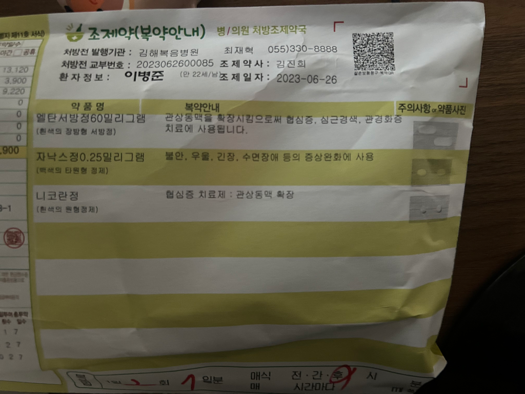 답변 부탁드립니다.. 급성 심근경색이나 심근경색은 아니겠죠..? ㅜㅜ 사진은 오늘 처방받은 약이랑 어제 응급실 진료기록지입니다 도와주세요..
