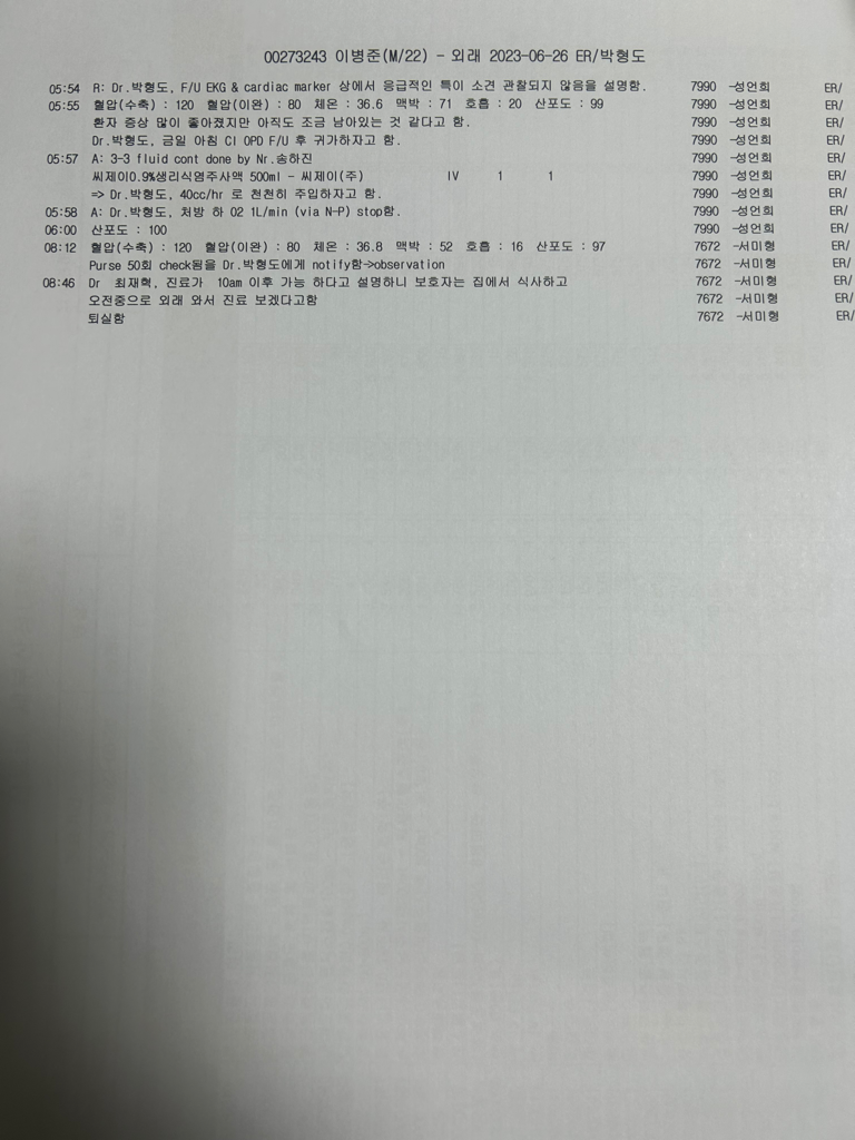 그러다 3시간후 피검사를 하고 결과를 설명해주셨는데 피검사는 매우 깨끗하다고 말씀하셨습니다 혈관이 막힌거 같지는 않다라고 하셨습니다 심전도도 한번 더 찍어봤는데 처음내원했을때보다 더 좋아졌다 라고 하셨습니다 그래서 오전10시에 외래로 심장내과로 돌려주시고