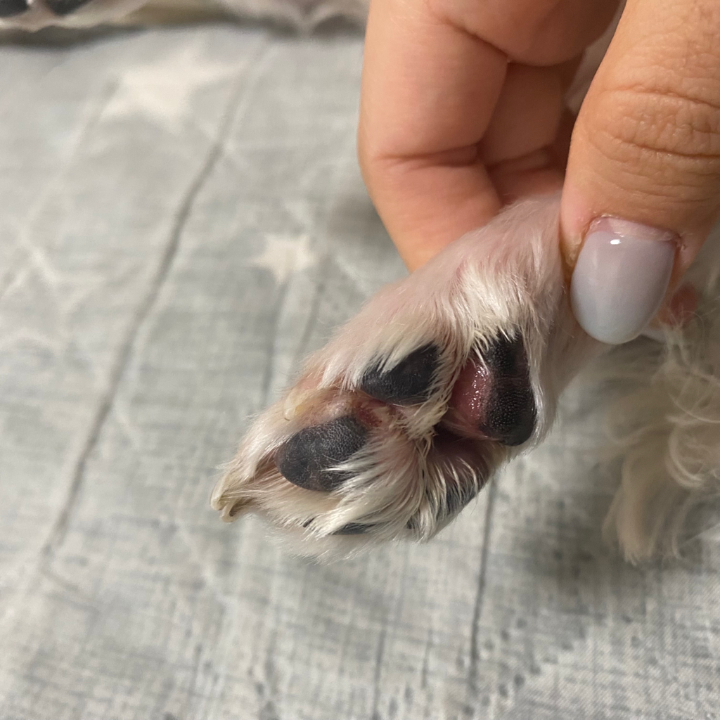 발바닥 안 쪽에 심한 발적이 보이는 것 같습니다. 아마 지간염이나 습진 때문에 평상시에도 소양감이 심해서 계속 핥아서 결국 저렇게 더 심하게된 것 같은데요