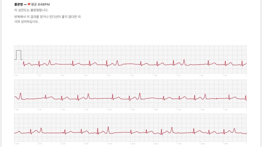 워치 심전도는 아직 정확도가 떨어지기 때문에 참고만 하시고 불편 증상이 지속되는 경우 다시 병원을 방문하여 표준 12유도 심전도와 홀터 검사를 받아볼 것을 권합니다.