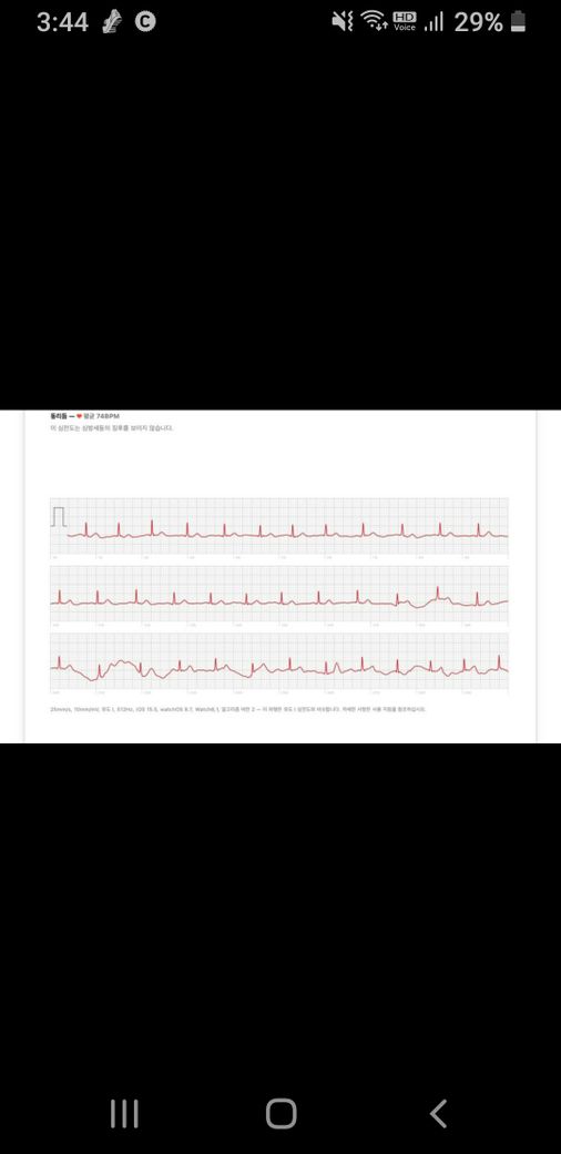 심전도는 각각 팔과 다리에 전극을 붙여 보통 3개의 표준사지유도와 3개의 증폭사지유도 그리고 12개이 전흉부유도를 이용하여 12가지 심전도를 얻는 것이 일반적인 표준 심전도입니다. 스마트 워치는 대부분 한손을 손목에차고 다른 손을 이용해 용두에 닿게 하면 기본적인 사지유도 중 하나가 만들어 질 수 있으므로 심전도를 발생하게 합니다. 현재 심전도 기저 리듬이 흔들리고 있어 정확히 파악이 어렵지만 심실 조기 수축의 가능성이 있습니다.